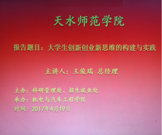 为了更好的为大学生提供新的创新创业思维,2017年4月19日下午4:30,德赢·vwin体育在校4号报告厅举办了天水师范学院大学生创新创业新思维的构建与实践报告会。报告会邀请我院2011届毕业生,正和阳光科技有限责任公司总经理王俊瑞为主讲嘉宾。德赢·vwin体育党总支书记崔兆庚,党总支副书记罗莉以及分团委辅导员剡晓旭王建刚参加了本次报告会。报告会由党总支副书记罗莉主持。