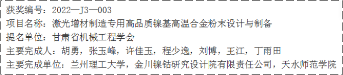 近日,甘肃省人民政府公布了2022年度甘肃省科学技术奖励的决定。我院教师刘博作为主要完成人完成的项目“激光增材制造专用高品质镍基高温合金粉末设计与制备”,被授予甘肃省科技进步奖三等奖。