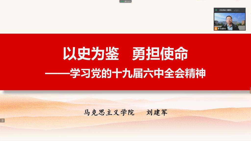 11月25日下午,学院党总支召开了线上党的十九届六中全会精神学习宣讲会,马克思主义学院院长刘建军作了专题辅导报告。学院党总支书记牛永江主持会议并讲话,学院全体教职工以及部分学生党员共计七十余人参加了学习报告会。