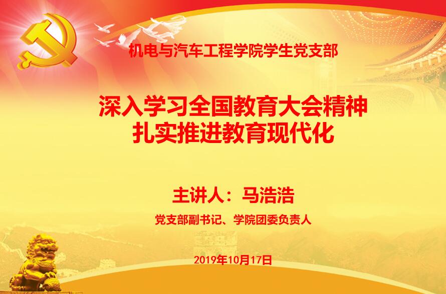 为进一步贯彻关于“主题党日”和“三会一课”的党建活动,10月17日下午,我院学生党支部在4S321室,组织支部全体党员开展深入学习全国教育大会精神扎实推进教育现代化党课学习活动,由支部副书记马浩浩同志主讲。