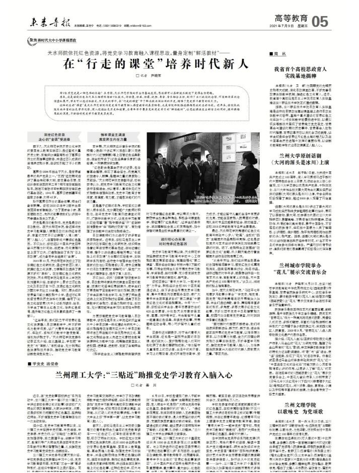 党史学习教育开展以来,天水师范学院坚持把党史学习教育与学校中心工作和改革发展紧密结合,梳理出强化“第二课堂”、服务社会助推乡村振兴等5方面的实事,引导全校师生扎实开展党史学习教育,学深悟透、践行实事,充分感受到党史学习教育带来的新变化、新气象。该校团委以“青年大学习,一起学党史”为平台,积极组织全校391个团支部通过线上、线下多途径开展党史学习教育,集中开展系列志愿服务活动,使广大青年学生在丰富多彩的“第二课堂”中接受红色文化的感染和熏陶。今年“六一”前,该校组织学生会、青年志愿者协会的620名志愿者,分批赴天水市秦安县王窑、郭嘉、刘坪等学区,与当地留守儿童一起重温红色经典、共读党史故事、开展趣味运动会等,用心呵护留守儿童的成长。团委书记刘颖表示,对于当代青年大学生而言,这也是一堂别开生面的思政课,他们在关心、爱护和帮助他人的同时也收获了自身的磨砺和成长。“作为留守儿童情感上的交谈者、生活中的关怀者、学习上的帮助者,我们只有励志勤学、努力成才,才能让留守儿童的生活中有更多的光亮,才能在国家和人民需要的时候,用扎实的专业技能奉献社会、报效祖国。”该校2018级学前教育专业学生秦婧说。最近,天水师范学院筹建的红色文化教育与体验中心步入“收尾”,全校的“四史”主题美术作品展即将亮相,这也是该校美术与艺术设计学院院长刘晓毅最忙碌的时刻。眼下,他和师生正在围绕“陇原红色文化”主题,热火朝天地进行着主题美术创作活动和布展工作。“从去年开始,我们组织师生赴革命纪念馆等地观摩学习,接受红色文化熏陶和洗礼,回来后再集体讨论,构思作品。创作过程历时半年多,就是想创作出一批有艺术水准、有教育意义的作品,向中国共产党成立100周年献礼。”谈及此,刘晓毅的脸上难掩喜色。如今,在天水师范学院,“习近平七年知青岁月故事分享会”“学党史、知党情、跟党走”知识竞赛等活动开展地如火如荼,学生们通过诗歌、音乐、舞蹈等丰富多彩的形式,多角度、多层次展示红色文化故事,不断从百年党史中汲取智慧和力量,校园内处处都有党史课堂,时时刻刻传承着红色基因……“面对新时代新要求新使命,我们将继续探索新途径、新方式、新方法,结合当前正在开展的党史学习教育,以悟思想为根本,以办实事为关键,全力抓好理论研究和办实事实践活动,不断丰富学习形式,推动党史学习教育入脑入心,为培养担当民族复兴大任的时代新人贡献更大力量。”李正元说。(记者 尹晓军)