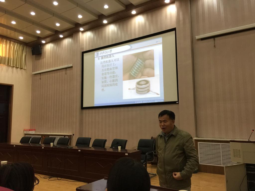 张小栋教授以其渊博的知识,独到的见识为在场师生介绍了工业4.0的基本概念、发展由来、关键技术和特点,工业4.0对中国产业发展的作用;机器人的概念、内涵和关键技术,以及当今两类主流机器人——工业机器人和服务机器人的发展现状和发展趋势;最后,张教授结合自己研究团队所取得的成果和工作经验,介绍了一些智能机器人研究的前沿技术。