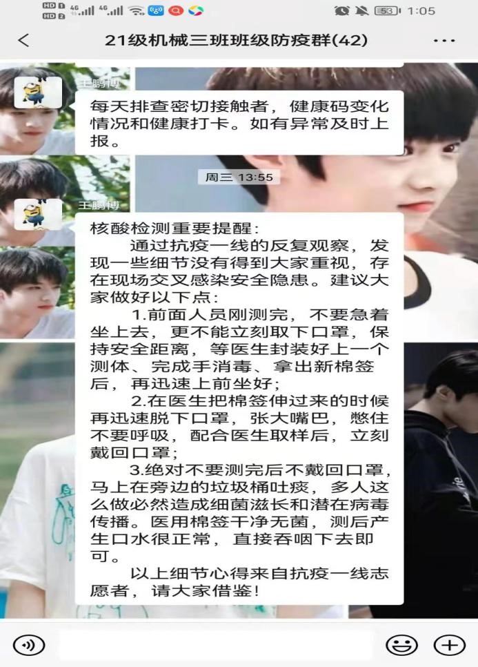 我院班主任与辅导员还通过电话、短信等途径与学生保持联系,对所有在校学生自疫情发生以来的行程轨迹进行全面摸排,先后开展多次分类筛选统计,实施核酸检测、健康打卡、密接查询、健康码异常与思想状况日报告制度,对学生特别是健康码异常的留观学生做好心理辅导工作,准确掌握学生思想动态,确保工作部署和信息反馈畅通无阻。老师们还给学生们推送《甘肃省教育厅高全省高校学生书》《天水师范学院关于守卫’无疫’校园的倡议书》等多篇文章和通知,科普防控知识,关心学生健康,引导学生不信谣、不传谣,坚定信心、齐心抗疫。