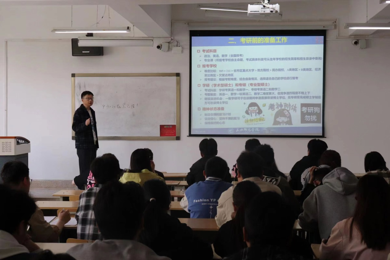 杨程老师首先结合个人经历分享了考研经验,指导同学们及时调整考研状态,多做真题,全力以赴。同时鼓励同学们要结合自身的实际情况选择报考院校,不要盲目跟风;要明确考研目标,理清考研与就业的关系,合理定位。最后,杨程老师从毕业生人数、考研升学率、就业形势等方面进行考研数据剖析,为同学们详细介绍了近年来我院研究生的报考、录取情况,进而从选择院校、报考专业、复习策略等方面为同学们提供指导与建议。