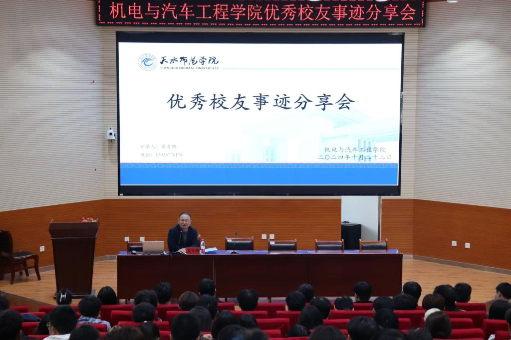 为深入学习贯彻党的二十届三中全会精神,庆祝建校65周年,展现我院优秀毕业生志存高远、拼搏进取的风采。10月22日下午学院邀请2011届机械设计制造及其自动化专业毕业生莫负鹏校友在三号报告厅举办了“优秀校友事迹分享会”。报告会由学院党委副书记范学智主持,学院师生近300人参加。