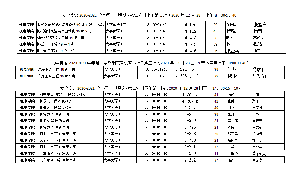 《大学英语》2020-2021学年第一学期期末考试安排